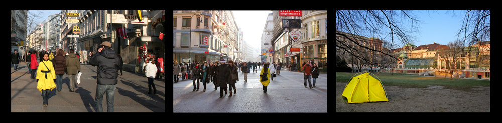 The series addresses mobility as a spatial practice. Public space, architecture, and landscape are not treated as fixed entities but as conditions under which temporary forms of shelter and habitation can be produced. Space emerges through action, use, and duration.